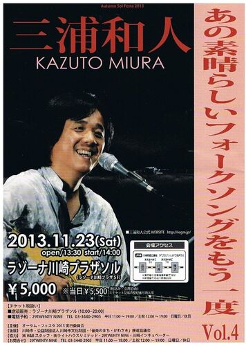 三浦和人 LIVE 2013 ~風のように時のように~ 11月6日(水) 広島 LIVE楽座 広島市中区立町6-1 立町ウイング BF-1A http://www13.ocn.ne.jp/~rakuza/ 開場 18:30 開演 19:00 前売 ¥4000 (全席自由、要別途1ドリンク) 一般発売中 チケットぴあ、ローソンチ…
