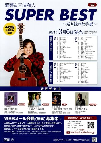 楽しみなコンサートをありがとうございます 「三浦和人 LIVE 2024 ~送り続けた手紙~」 出演 三浦和人 メンバー 鳩野信二(Key) 7月14日( 日) 開場 15 : 30 開演 16 : 00大分音楽館 大分市都町2丁目1-24 大分駅北口より徒歩9分 全席自由 前売 5000円 当日 …